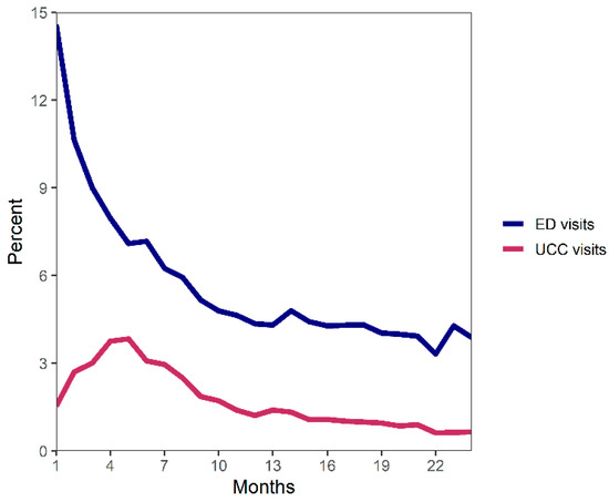 The rate of UCC visits increased during the first 4 months after the start of UCC eligibility and then decreased over time (Figure 1). In contrast, the rate of ED visits was highest immediately after the start of eligibility and decreased over time. The ED visit rate was 4 times higher than the UCC visit rate.