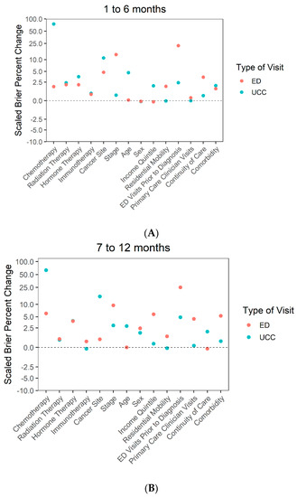 The following are available online at https://www.mdpi.com/article/10.3390/curroncol28030165/s1, Figure S1: Description of when individuals diagnosed with cancer were included in the study cohort, Figure S2: Percentage of individuals who had a UCC visit and an ED visit by follow-up month. Table S1: List of ED visits excluded from the analyses, Table S2: Hours between triage and discharge for individuals who visited the UCC or an ED by CTAS score, 2013–2016, Winnipeg, Manitoba (N = 13,252 visits), Table S3: Percent change in scaled Brier scores from full model for UCC and ED visits by variable and follow-up period, Table S4: Percent change in scaled Brier score from full model for UCC and ED visits by variable and follow-up period excluding sex from the model, Table S5: Percent change in scaled Brier score from full model for ED visits by variable and follow-up period only during UCC hours of operation and including all reasons for an ED visit.