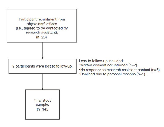 Fourteen of 23 (61%) eligible participants completed the study (Figure 1). The mean age of participants was 59 years (SD: 10.6, range 42–76). Most (Table 1) were female (71%), had college/undergraduate education or higher (71%), and lived with a partner in the home (79%). Most patients had a prior surgical history or experience with surgery (86%), and two-thirds had completed surgery prior to being interviewed (Table 1). The median wait time from initial consultation to time of surgery or research interview was 143 days (IQR 108–178 days).
