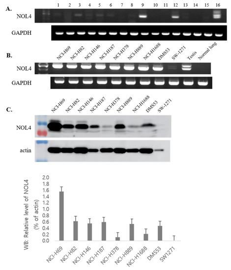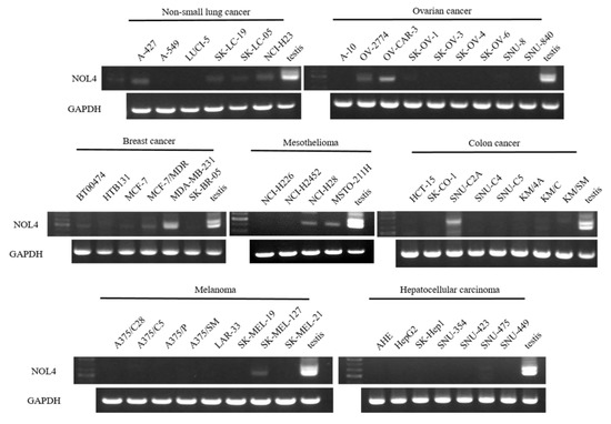 To investigate the restricted expression of NOL4 mRNAs in normal adult tissues, RT-PCR was performed. As shown in Figure 1A, NOL4 mRNA was strongly expressed in testis and showed high expression in brain and pancreas, and there was little expression in prostate, small intestine, brain, and pancreas. NOL4 mRNA and proteins were frequently present in SCLC cell lines (8/9, 8/9), respectively (Figure 1B,C). In addition, NOL4 mRNA was expressed weakly, detected at a low frequency, or not detected, in non-small-cell lung cancer, ovarian cancer, breast cancer, mesothelioma, colon cancer, melanoma, and hepatocellular carcinoma (Figure 2). These results indicate that NOL4 may be cancer/testis antigen that is frequently expressed in SCLC.