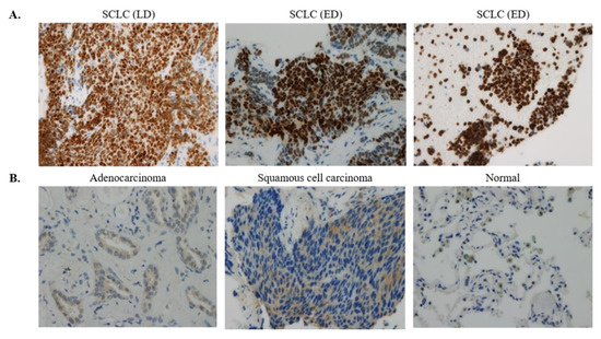 Globally, small-cell lung cancer (SCLC) accounts for 13–15% of all lung cancers, with about 250,000 diagnosed annually, and is a malignant tumor with a very high cancer-related mortality rate and a 5-year survival rate of 1–5% [1]. Only two stages of SCLC are distinguished clinically: limited disease (LD) with tumor confined to one hemithorax only versus extensive disease (ED) with metastases in the contralateral chest or at distant sites [2]. For 30 years, treatment of SCLC has not changed in nature, and effective treatment options for the recurrent disease have been lacking [2]. There are significant barriers to progress in SCLC because of small diagnostic biopsies and the rare use of surgical resection in standard treatment, and rapid disease progression [2]. However, for the past five years, the development of clinical therapeutic strategies, including immunotherapy and new molecular targets, has been undertaken at the molecular level through the discovery of molecular mechanisms and development of models for SCLC [3,4,5]. Therefore, the discovery of molecular targets for early detection and taking a new approach to therapy in SCLC are important.