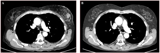 At the end of neoadjuvant treatment for breast cancer, she had a major clinical improvement of dermatomyositis with normalization of CK values and muscular weakness mostly recovered. Breast ultrasound and mammography showed a complete response to treatment and total body CT was negative for metastases. In April 2020 the patient underwent left mastectomy and axillary node resection with a pathologic (ypT0, ypN0, ycM0) and a radiologic complete response (shown in Figure 2), and full regression of dermatomyositis symptoms.