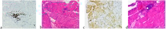 Deltoid muscle biopsy showed (b) fiber size variability with perifascicular atrophy, fiber necrosis and regeneration, (a,d) perimysial inflammatory infiltrates and (c) sarcolemmal expression of MxA (Myxovirus Resistance Protein).