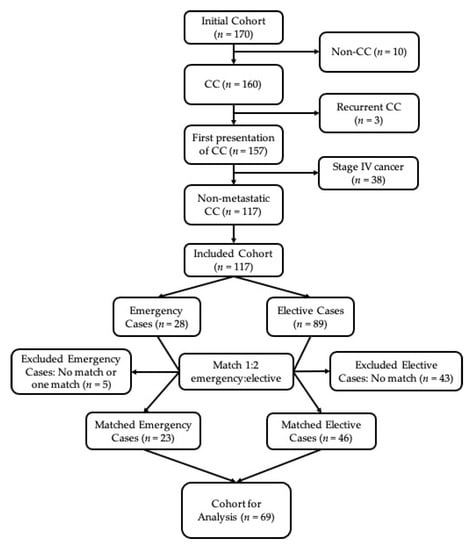 We conducted a matched case-control study on patients who underwent a colon cancer operation from 1 January 2017 to 28 February 2019 at an academic tertiary care center. This center manages elective patients through its cancer center, but patients presenting acutely through the emergency department are managed by the ACS service. Data were collected through the National Surgical Quality Improvement Program (NSQIP) and supplemented with additional information obtained from directed chart review. Exclusion criteria applied to the initial cohort (n = 170) were: non-resection/diversion procedures, rectal cancer, recurrent cancers, known stage IV disease, and non-adenocarcinoma disease. After exclusion criteria were applied, the initial cohort was divided into two groups: emergency (EM) cases (booked for surgery as an emergency case once the patient is admitted to hospital), and elective (EL) cases (underwent a planned operation in the elective operating schedule) based on procedure booking priority and confirmed by chart review. Each EM case was matched to two EL cases with respect to age (within 10 years), sex, and overall cancer stage. Patients who could not be matched 1:2 were excluded (5 EM cases and 43 EL cases). The final cohort used for analysis compared 23 EM cases to 46 EL cases (n = 69). Figure 1 illustrates the matched cohort build.
