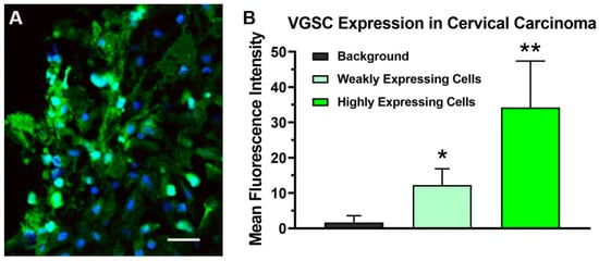 The photomicrographs depict the immunohistochemical labeling of voltage-gated sodium channels (VGSCs) (green) in a biopsy of the stage IIB carcinoma of the cervix obtained from the patient prior to treatment with targeted osmotic lysis (TOL). Sections were incubated and then processed with a goat-anti-rabbit 488 Alexa fluorophore secondary antibody, 1:800 dilution. Nuclei were counterstained with DRAQ5 (blue; dilution 1:600). Twelve images taken with a Leica DMi8 confocal microscope at 40× oil magnification were reviewed for evidence of VGSC labeling. Panel (A) depicts a representative portion of the biopsy where many cells, approximately 40% of the total, highly expressed VGSCs. Cellular profiles from three sections were outlined and the mean fluorescence intensity was measured using the ImageJ-FIJI software (imagej.nih.gov; accessed on 19 May 2021) to quantify the sodium channel expression. The histogram (B) presents the average mean fluorescence intensity measured from 50 intensely stained and 50 weakly stained cell profiles compared to the background indicative of the level of VGSC expression in highly expressing tumor cells and minimally expressing neoplastic and stromal cells, respectively. A one-way ANOVA was significant (p < 0.00001); * = p < 0.001 compared to the background; ** = p < 0.001 compared to weakly expressing cells (Student’s t-test with Scheffe’s adjustment). Calibration bar in A = 25 µm.