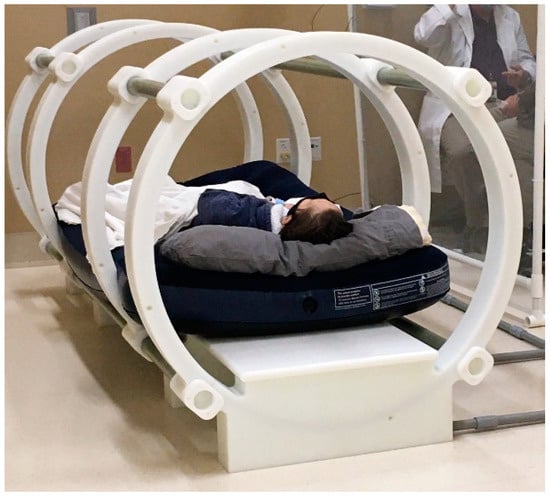 The photograph depicts the patient in the bore of the custom-built coaxial ring device used to deliver the uniform pulsed electric fields necessary for opening the VGSCs in TOL (The Phantom Laboratory, Salem, NY, USA).