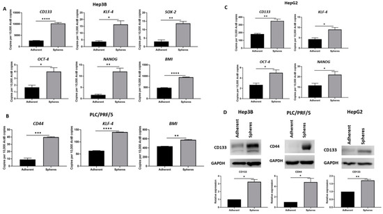 Human HCC-derived spheres exhibit stem-cell-like features. (A) qRT-PCR demonstrated upregulation of stem cell markers CD133, KLF-4, SOX-2, OCT-4, NANOG, and BMI in Hep3B-derived spheres compared to adherent Hep3B cells. (B) PLC/PRF/5-derived spheres exhibited increased expression of CD44, KLF-4 and BMI compared to adherent cells as shown by qRT-PCR. (C) qRT-PCR revealed higher expression of CD133, KLF-4, OCT-4 and NANOG in HepG2-derived spheres compared to parental cells. (D) Increased CD133 expression in Hep3B and HepG2-derived spheres and upregulation of CD44 in PLC/PRF/5-derived spheres compared to adherent cells. GAPDH was the loading control. Detailed information about Western Blot can be found at Supplementary Materials. (n = 3, * p < 0.05, ** p < 0.01, *** p < 0.005, **** p < 0.001).