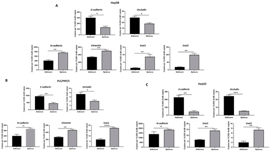 Human HCC-derived spheres exhibit mesenchymal phenotype. qRT-PCR demonstrated (A) a decrease in epithelial markers E-cadherin and Occludin and an increase in mesenchymal markers N-cadherin, Vimentin, Snai1 and Snai2 expression in Hep3B-derived spheres compared to adherent cells, (B) a reduction in E-cadherin and Occludin expression and an elevation in N-cadherin, Vimentin and Snai1 expression in PLC/PRF/5-derived spheres compared to adherent cells, and (C) downregulation of E-cadherin and Occludin and upregulation of N-cadherin, Snai1 and Snai2 in HepG2-derived spheres compared to adherent cells. (n = 3, * p < 0.05, ** p < 0.01, *** p < 0.005, **** p < 0.001, ns: not significant).