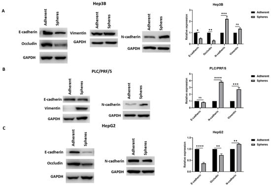 Human HCC-derived spheres exhibit mesenchymal phenotype. Western blot analysis revealed (A) a decrease in E-cadherin and Occludin expression and an increase in N-cadherin and Vimentin expression in Hep3B-derived spheres compared to adherent cells, (B) reduced expression of E-cadherin and elevated expression of N-cadherin and Vimentin in PLC/PRF/5-derived spheres compared to adherent cells, and (C) reduced expression of E-cadherin and Occludin and elevated expression of N-cadherin in HepG2-derived spheres compared to adherent cells. Detailed information about Western Blot can be found at Supplementary Materials. (n = 3, * p < 0.05, ** p < 0.01, *** p < 0.005, **** p < 0.001, ns: not significant).