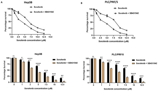 Given our observation that HCC-derived CSCs exhibit a mesenchymal phenotype and have a close association with EMT during the activation of TGF-β1 signalling in Hep3B and PLC/PRF/5-derived spheres, we hypothesise that EMT may be responsible for maintaining tumour growth and therapy resistance in Hep3B and PLC/PRF/5-derived CSCs. Thus, we utilised SB431542, a specific inhibitor of TGF-β receptor kinase, to treat Hep3B and PLC/PRF/5-derived CSCs with a concentration of 2 µM for a period of 72 h to assess the variation in cytotoxic effects of Sorafenib alone versus in combination with SB431542 (inhibition of TGF-β1-induced EMT). The proliferation assay demonstrated that the cytotoxic effects of Sorafenib in HCC-derived CSCs was enhanced when combined with SB431542 in comparison to Sorafenib alone (Figure 6A,B), suggesting better therapeutic efficacy of Sorafenib when combined with an EMT inhibitor.