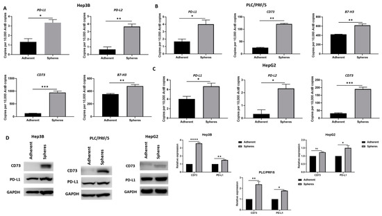 Human HCC-derived spheres overexpress immune checkpoint molecules. (A) qRT-PCR demonstrated upregulation of PD-L1, PD-L2, CD73 and B7-H3 in Hep3B-derived spheres compared to adherent cells. (B) PLC/PRF/5-derived spheres overexpress PD-L1, CD73 and B7-H3 compared to adherent cells, and (C) HepG2-derived spheres exhibited increased expression of PD-L1, PD-L2 and CD73 compared to adherent cells, as revealed by qRT-PCR. (D) Western blot analysis demonstrated an increase in CD73 and PD-L1 expression in Hep3B, PLC/PRF/5 and HepG2-derived spheres compared to adherent cells. GAPDH was the loading control. Detailed information about Western Blot can be found at Supplementary Materials. (n = 3, * p < 0.05, ** p < 0.01, *** p < 0.005, **** p < 0.001, ns: not significant).