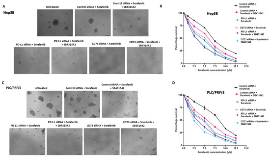 Further, we assessed the effects of EMT inhibitor, SB431542, alone and in combination with either PD-L1 or CD73 knockdown on the cytotoxicity of Sorafenib. The proliferation assay demonstrated that the number and size of spheres formed at Day 5 were significantly reduced when Sorafenib was combined with SB431542 and/or PD-L1 or CD73 siRNA in Hep3B (Figure 8A,B). Similarly, we noted that the reduction in the number and size of spheres when combined with Sorafenib was combined with SB431542 and/or PD-L1 siRNA or CD73 siRNA in PLC/PRF/5 (Figure 8C,D). We also observed better therapeutic effects of CD73 knockdown on Sorafenib and SB431542 in comparison to PD-L1 knockdown.
