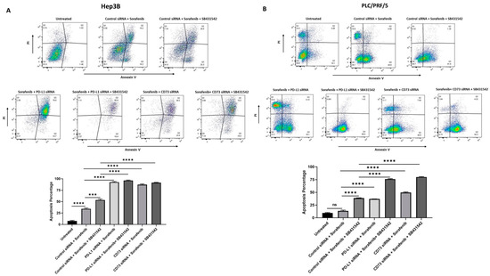 To further validate the increased cytotoxic effects of Sorafenib on HCC-derived CSCs with combined targeting of EMT and immune checkpoint molecules, we used flow cytometry analysis to examine apoptosis induced by Sorafenib alone versus combination with EMT inhibitor and/or immune checkpoint inhibitors. We observed that the percentage of apoptotic spheres increased with a combination therapy of SB431542 and immune checkpoint inhibitors (PD-L1 siRNA or CD73 siRNA) with Sorafenib compared to Sorafenib alone in both Hep3B (Figure 9A) and PLC/PRF/5-derived (Figure 9B) CSCs. These findings suggest that the combined targeting of EMT and immune checkpoint molecules can enhance the cytotoxic effects of Sorafenib or overcome the resistance of HCC-derived CSCs to Sorafenib, resulting in effective chemotherapeutic outcome in HCC.