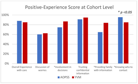 Positive experience scores were reported similarly at the cohort level with minimal score differences (1–4%) between the two PREMs for three of the six questions (Figure 1). The positive “overall experience with care” score was 87.9% for the AOPSS cohort and 85% for the YVM cohort and both cohorts had similar positive experience scores in “discussion of worries” and “trusting provider with confidential information”. The YVM cohort reported higher positive experience scores in “involvement of decisions” and “providing family with information”, while the AOPSS cohort reported a higher positive experience score than the YVM cohort in “knowing who to contact”.