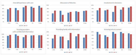 Differences in positive responses for each question, by tumor group are presented in Figure 2. Positive experience scores by tumor group differed in all questions. The “overall experience with care” was reported more favorably in AOPSS in three tumor groups (lung, breast, and genitourinary). The largest score difference was observed in the lung group (14%). Conversely, overall experience of care was reported more favorably in YVM in two tumor groups (gastrointestinal and other) with the largest score difference observed in the gastrointestinal group (9%).