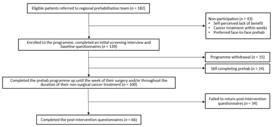 The patient flow chart is presented in Figure 1. A total of 182 patients were referred to our service between late March and December 2020. The patients were referred from nine hospital trusts and three general practices. These sites covered a wide geographical area across the south of England, including London, Kent, Surrey, Oxfordshire, and Hertfordshire. The patients were referred from multiple cancer specialties, including colorectal (n = 102), urology (n = 42), breast (n = 18), lung (n = 13), hepatobiliary (n = 2), neurosurgery (n = 2), and unknown (n = 3, the patients did not disclose). The referral sources varied; cancer specialist nurses (n = 89), clinical support workers (n = 30), hospital doctors (n = 35, including anesthetists, oncologists, surgeons), patient self-referrals (n = 11), general practitioners (n = 2), physiotherapists (n = 1), and unknown (n = 14, the referrers did not disclose). Of the 182 patients that were referred, 139 (76%) patients agreed to partake, and 43 (24%) patients declined or were unable to participate. The most common reasons for non-participation included a self-perceived lack of benefit (e.g., they felt they were already fit and healthy, or had existing multiple co-morbidities and felt the program was not suitable for them), their cancer treatment was due within weeks, and they did not want to enroll unless it was face-to-face.