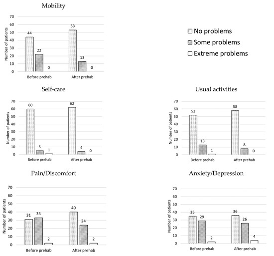 Number of patients per dimension (mobility, self-care, usual activities, pain/discomfort, and anxiety/depression) and level of problems (no problems, some problems, extreme problems), before and after undergoing prehabilitation. A greater number of patients selecting “No problems” in the different dimensions after undergoing prehabilitation suggests the intervention was effective in improving quality of life.