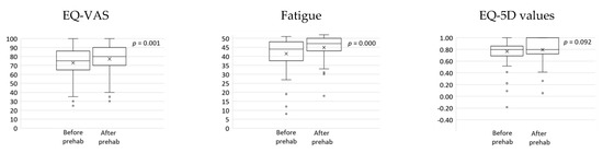 Boxplots depicting self-rated health (EQ-VAS), fatigue, and EQ-5D values, before and after prehabilitation. Statistically significant improvements were found in self-rated health (p = 0.001) and fatigue (p = 0.000).