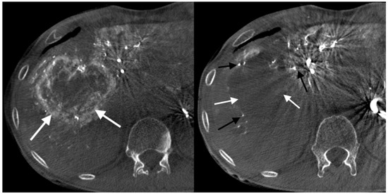 Cone-beam computed tomography image was performed through the SIM catheter in the coeliac artery using 45 mL Iodixanolum (320 mg I/mL) with flow rate of 5 mL/s. Devascularization of a colorectal cancer metastatic liver focal lesion. Left, before the procedure: visible pathological tumor vessels (white arrows). Right, three weeks after the procedure: preserved patency of subsegmental branches (black arrows) and almost complete devascularization of tumor vessels (white arrows).