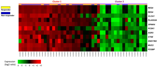 Expression profiles of the top 10 differentially expressed genes linked to CCRT resistance from a public transcriptome dataset (GSE35452) in the GEO database. All probes were analyzed without preselection. The statistical significance of each transcript was examined by comparing responders to nonresponders. The expression levels of upregulated and downregulated genes are marked in red and green, respectively. The SPINK4 gene was identified as one of the most significantly upregulated genes among CCRT nonresponders.