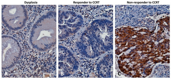 Higher SPINK4 immunoexpression was observed among CCRT nonresponders. Immunohistochemical staining was performed with an anti-SPINK4 antibody. Rectal dysplasia (A) revealed no expression of SPINK4. Tumor tissues showed low SPINK4 immunoexpression among CCRT responders and (B) high SPINK4 immunoexpression among CCRT nonresponders. (C) Scale bar, 100 µm.