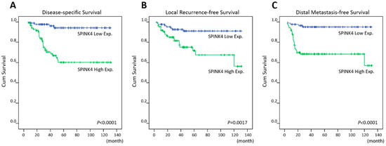 Survival analysis. Kaplan–Meier plots showed that high SPINK4 immunoexpression was significantly linked to worse (A) disease-specific survival, (B) local recurrence-free survival, and (C) metastasis-free survival.
