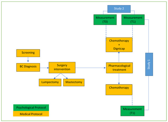 In Research Protocol 1, we conducted a randomised clinical control (RCT) study to evaluate the emotional impact of using scalp cooling technology in women with BC. The aim was to evaluate their psychological state after adjuvant chemotherapy in two conditions: Scalp cooling application and no scalp cooling application. The detection data were focused on the emotional impact of chemotherapy at the end of pharmacological treatment, comparing the two clinical settings: traditional setting vs. innovative setting.