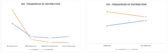 Distribution data evidenced that most patients showed no sign of depression, whereas low presence of depression signs were seen in both groups. In the DG group, three patients showed mild depression, two showed moderate depression, and three showed severe depression; in the NDG group, two patients reported mild depression, one moderate, and one showed severe depression. Regarding the psychological distress evaluation, more patients showed higher levels of distress (DG, n = 12; NDG, n = 9) than no distress frequencies (DG, n = 10; NDG, n = 13). Figure 3 shows the frequencies of distribution of patients in DG and NDG grouping for BDI and PDI testing.