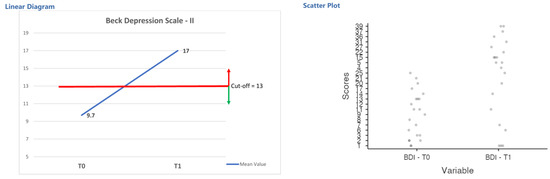 Table 4 indicates the raw score (and standard deviation) of the sample in psychological measurements in the test (T0) and retest (T1) procedure. The variables examined were: psychological distress (PDI), depression (BDI), anxiety (DASS-A), body apperception (MBA), body image (BIS), and expectations and satisfaction in using scalp cooling technology (ESDq). The repeated measures ANOVA highlighted significant differences in signs of depression (F(21,1) = 0.02; η2 = 0.11; p = 0.001); patients showed an increase of signs of mild depression after chemotherapy joined to the scalp cooling solution (see Figure 5).