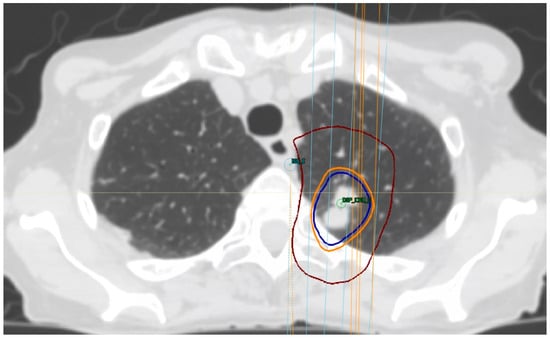 The lung dose constraints suggested by the American Association of Physicists in Medicine (AAPM) are V7 < 1500 cc for one fraction, V11.6 < 1500 cc for three fractions (2.9 Gy/fraction), and V12.5 Gy > 1500 cc for five fractions (2.5 Gy/fraction) to an endpoint grade 3 toxicity for basic lung function and V7.4 Gy < 100 cc for one fraction, V12.4 < 1000 cc for three fractions (3.1 Gy/fraction), and V13.5 < 1000 cc for five fractions for pneumonitis []. The Japan Clinical Oncology Group (JCOG) 0403 Protocol considered dose constraints for the lung with a mean dose ≤ 18 Gy, 40 Gy irradiated volume ≤ 100 cc, V15Gy < 25%, and V20 < 20% []. Dunlap et al. [] determined a dose constraint for the chest wall of 30 Gy in three to five fractions to < 30 cm3 to decrease the risk of toxicity without compromising tumor coverage.