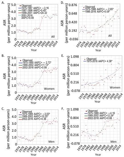 Joinpoint analysis of the UVM trends over the years. (A–C), overall trend for UVM at all ages; (A), both sexes; (B), women; and (C), men. (D–F), trends for younger patients under age 40; (D), both sexes; (E), women, (F), men. * indicates significant trend of p < 0.05.