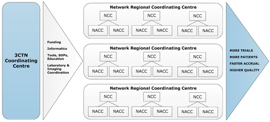 To address the impediments to academic clinical trial activities, the Canadian Cancer Research Alliance (CCRA) 2011 report on the status of clinical trials in Canada recommended the establishment of a pan-Canadian network that would provide funding and infrastructure to support the conduct of academic clinical trials [1]. In 2014, the Canadian Cancer Clinical Trials Network (3CTN; ‘the Network’) was established in collaboration with the Ontario Institute for Cancer Research (OICR), Canadian Cancer Trials Group (CCTG) and Network of Networks (N2). A total funding envelope of CAN 22 M raised was provided from 13 national and provincial charities, and public agencies. The Network has four components: (a) Coordinating Centre in Toronto serving as the administrative hub; (b) Network Regional Coordinating Centres (NRCC) that cover Canadian provinces and regions; (c) larger Network Cancer Centres (NCC); (d) smaller Network Affiliated Cancer Centres (NACC) that are linked to NCCs (Figure 1). The Network is comprised of 66 member institutions committed to the following goals and objectives for its initial four-year strategic plan: