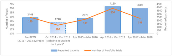 Since the formation of 3CTN as a pan-Canadian cancer network, there has been an increase in academic cancer clinical trial recruitment. From 2014 to 2018, a total of 11,275 patients were enrolled in Portfolio trials, with 3907 patients recruited in the last fiscal year, which was an increase of 59.6% above pre-3CTN baseline yearly totals, exceeding the recruitment target for the period. This was accomplished despite challenges due to declining numbers of Portfolio Phase III and other large study population randomized clinical trials during the same period.