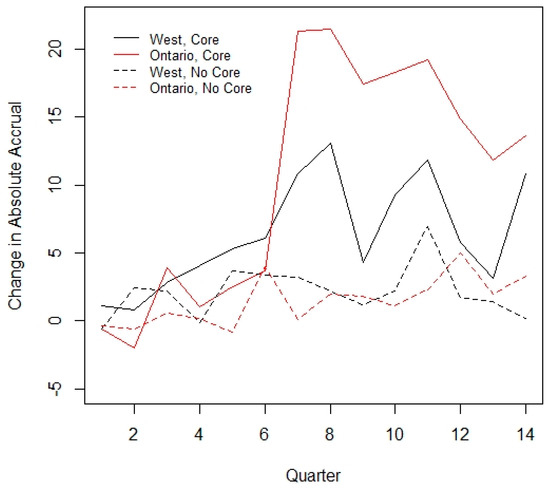 No interaction between core funding and time throughout the period was observed (p = 0.38). This indicates that the slope of accrual was similar between those sites that received core funding and those that did not. However, there was a relationship between core funding and region; notably, no site in Quebec received core funding during this time period. A supportive analysis performed excluding the Quebec sites gave similar results (analysis not included below, see Figure 3). Despite not being statistically significant, Western Canada and Ontario sites that received core funding had a marked increase in mean accrual starting in Year 3, which was not observed in the non-core funded sites. A further subgroup analysis was performed including only those 36 sites which reported data for the entire study period, with results similar to the overall data (see Appendix A Table A1 and Table A2).