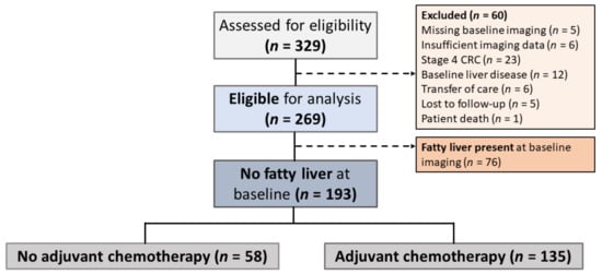 Overall, 329 patients who were diagnosed with stage II–III CRC at St. Michael’s Hospital from 1 January 2006 to 1 January 2017 were assessed for eligibility. Out of the 269 patients deemed eligible for analysis, 76 (28.3%) had fatty liver at baseline imaging, prior to treatment with adjuvant chemotherapy. The remaining 193 patients who did not have fatty liver at baseline were further divided by whether they received curative chemotherapy (Figure 1).