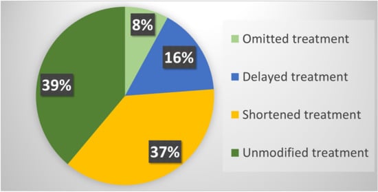 It is worth noting that the new guidelines were not applied in 38.5% of the patients included in the study. This was partly due to the lack of inclusion of some clinical settings in the published guidelines used in our experience. About 50.0% of these patients had gynecological malignancies referred for curative RT, for which there are no alternatives to standard fractionated and timely delivered treatment. Furthermore, we excluded the possibility of modifying RT in the case of short palliative treatments (1–2 days), considering both the need of symptoms relief and the minimal number of patients visits in the hospital, and stereotactic treatments, also in this case, considering the short treatment duration.