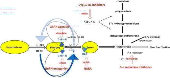Mechanism of action of antiandrogen therapy GnRH = gonadotropin releasing hormone receptor agonist; LH = luteinizing hormone; LH-RH= luteinizing hormone releasing hormone; GnRH-R = gonadotropin releasing hormone receptor; GnRH antagonist = gonadotropin releasing hormone antagonist; LH-R = luteinizing hormone receptor on testis; NARA = nonsteroidal androgen receptor antagonis; DHT = dihidrotestosterone, CYP 17A1 = cytochrome P450 17 A1; 5–10% of testosterone is transformed by 5-α reductase in the more potent DHT, 0.2% testosterone is transformed by aromatases in 17β-estradiol and the rest of testosterone is inactivated by the liver; GnRH agonists provoke an increase of LH in the first weeks of treatment but finally down regulate LH secretion from the anterior pituitary gland. GnRH antagonists block the GnRH receptors on the anterior pituitary gland thus decreasing the synthesis of LH and FSH. NARA block the activation of the androgen receptor from the prostate cells and augment the effectiveness of GnRH agonists or antagonists, CYP 17 A1 inhibitors decrease the synthesis of testosterone from cholesterol.