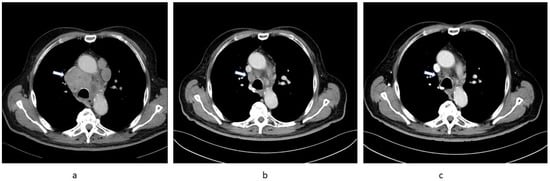 Sequential chest CT images of Patient 1 showing regression of substantial mediastinal lymphadenopathy (arrow). (a) 28 August 2020, (b) 15 February 2021, (c) 18 May 2021.