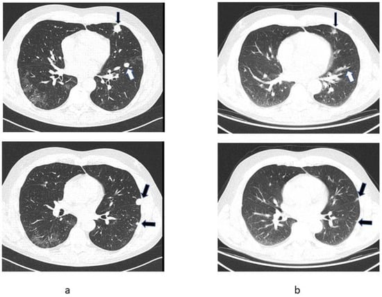 Sequential chest CT images of Patient 2 showing partial regression of pulmonary metastases (arrows). (a) CT scan of 15 April 2021, (b) CT-registered images from PET/CT scan of 20 July 2021.