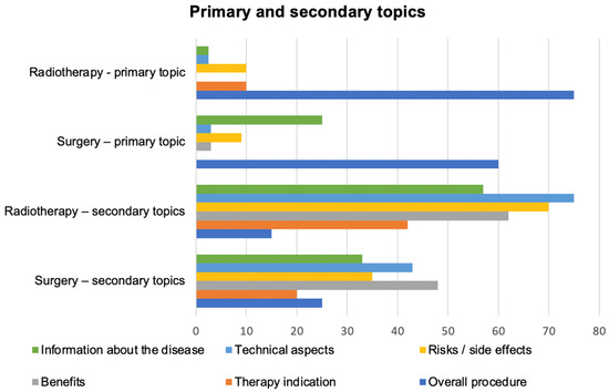 Most of the videos concerning radiotherapy (60%) and surgery (48%) were provided by healthcare professionals (doctor, clinic, hospital or university). Videos provided by patients were nearly three times more likely to be found in the surgery group (22%) than the radiotherapy group (7.5%). Societies (foundations, governmental institutions, academic journals) provided 20% of the radiotherapy videos and 10% of the surgery videos. Other providers (industry, news media) ranged between 5% and 15 % for both groups. The most common primary topic was the overall procedure (radiotherapy: 75%, surgery: 60%), the secondary topics of the videos varied widely between the two groups (Figure 1).