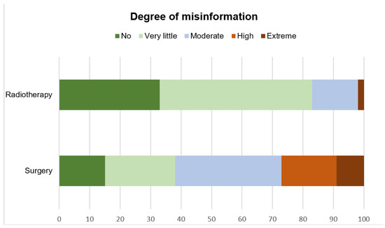 Although 15% (surgery) to 23% (radiotherapy) of the videos contained commercial bias, only 10% (surgery) and 5% (radiotherapy) of the providers included a disclosure of their conflicts of interest. For both treatment modalities assessed, 19 videos (13 about radiotherapy [33%] and 6 about surgery [15%]) were rated to have no misinformation. In general, videos about radiotherapy were rated to have much less misinformation than surgery videos as demonstrated in Figure 2.