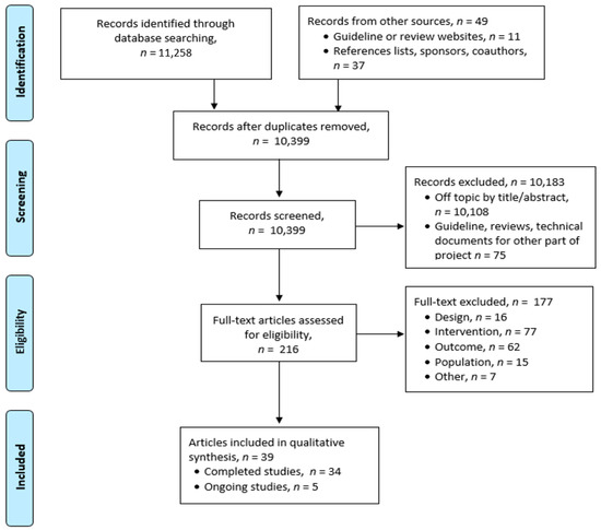 The literature search resulted in 11,307 citations, of which 216 required full-text review. Thirty-nine publications representing 23 clinical studies and 5 ongoing trials met our pre-planned selection criteria (Figure 1). The trials found have been divided into those that provide psychosocial or genetic counselling, and those that provide or assess medical and supportive care.