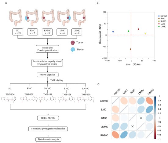 Quantitative characteristics of protein profiles. (A) Experimental workflow. (B) Principal component analysis of protein profiles of normal, RMC, RNMC, LMC, and LNMC. (C) Correlation matrix showing the protein abundance correlations between normal, RMC, RNMC, LMC, and LNMC.