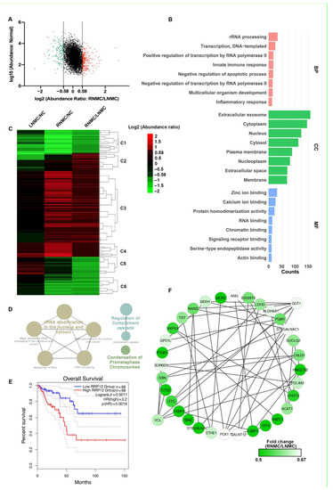 Functional analysis of differentially expressed proteins (DEPs) between RNMC and LNMC tissues. (A) Scatter plot showing the distribution of upregulated (red dots) and downregulated (green dots) DEPs. (B) GO analysis indicated enrichment of these DEPs in biological processing (BP), cellular component (CC), and molecular function (MF). (C) Hierarchical clustering analysis and heatmap of DEPs. The heatmap was constructed based on a log2 transformation of relative abundance ratios (RNMC/LNMC). (D) REACTOME pathway analysis of the RNMC-specific upregulated DEPs. (E) The Kaplan–Meier survival analysis indicated inferior overall survival among colon cancer patients with high RRP12 expression. (F) The RNMC-specific downregulated DEPs in the protein–protein interaction networks are shown as nodes (MS data presented as the 131/130 ratios were matched to STRING networks). The intensity of the green color indicates the ratio of protein abundance in RNMC/LNMC. The protein abundance of tumor tissue relative to normal tissue is indicated in different colors, with red indicating up-regulated protein and green indicating down-regulated protein.