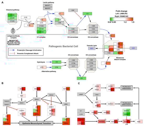Pathways enriched in the RNMC-specific DEPs. MS data presented as the 130/126 (left) and 131/126 (right) ratios. Up or downregulation of identified proteins is indicated by colors in the pathway (upregulated in red, downregulated in green). (A) The DEPs mapped to the complement activation pathway. (B) The DEPs mapped to EMT in the CRC pathway. (C) The DEPs mapped to the MAPK signaling pathway. The protein abundance of tumor tissue relative to normal tissue is indicated in different colors, with red indicating up-regulated protein and green indicating down-regulated protein.