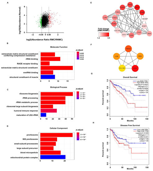 Functional analysis of DEPs between RMC and RNMC. (A) Scatter plot showing the distribution of upregulated (red dots) and downregulated (green dots) differentially expressed proteins (DEPs). (B–D) GO analysis indicated enrichment of these DEPs in molecular function (MF), biological processing (BP), and biological cellular component (CC). (E) The ECM-related DEPs in the protein–protein interaction networks are shown as nodes (MS data presented as the 129/131 ratios were matched to STRING networks). The intensity of the red color indicates the ratio of protein abundance in RMC/RNMC. (F) The hub proteins of ECM-related DEPs identified by the MCODE plug-in in RMC. The Kaplan–Meier survival analysis indicated inferior overall survival and disease-free survival among colon cancer patients with high expression of BGN and LUM, respectively. (G) The elevated BGN mRNA expression in colorectal cancer is positively associated with poor prognosis (log-rank test p = 0.0023). (H) The elevated LUM mRNA expression in colorectal tumor tissues is also positively associated with poor prognosis (log-rank test p = 0.029).