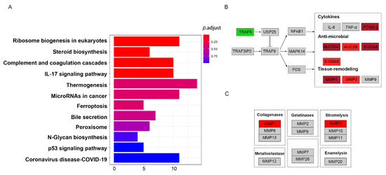 Pathway analysis of DEPs between RMC and RNMC. The identified proteins were indicated by colors in the pathway (upregulated in red, downregulated in green). (A) The DEPs enriched in the KEGG pathways. (B) The DEPs mapped to the IL-17 pathway. (C) The DEPs mapped to the matrix metalloproteinase signaling pathway.