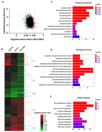 Functional analysis of DEPs between LMC and LNMC. (A) Scatter plot showing the distribution of upregulated (red dots) and downregulated (green dots) DEPs. (B) Hierarchical clustering analysis and heatmap of DEPs. The heatmap was constructed based on a log2 transformation of relative abundance ratios (LMC/LNMC). (C,D) GO analysis indicated the enrichment of these DEPs in cellular component (CC) and biological processing (BP). (E) Pathway analysis of DEPs between LMC and LNMC.