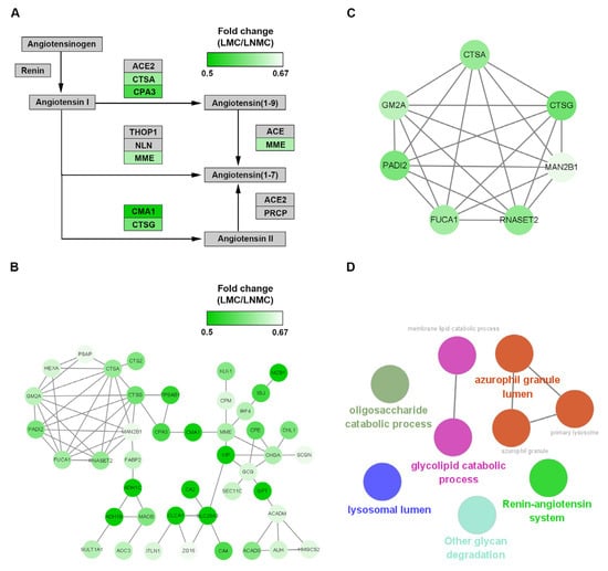 The DEPs enriched in the renin-angiotensin pathway were also visualized using Cytoscape (Figure 7A). The expression ratios of the DEPs between LMC and LNMC were represented by color intensity in heatmaps. Among the mapped proteins, lysosomal protective protein (CTSA), cathepsin G (CTSG), mast cell carboxypeptidase A (CPA3), neprilysin (MME), and calmodulin-1 (CMA1) were all strongly downregulated (relative abundance of protein as a TMT-128/TMT-130 ratio < 0.67). The pathway analysis indicated that LMC was closely associated with the angiotensin pathways. As show in Figure 7A, the downregulated DEPs mapped to the pathway had the capacity to inhibit the formation of angiotensin (1–7), which is related to tumor growth, invasion, and metastasis in various cancers.