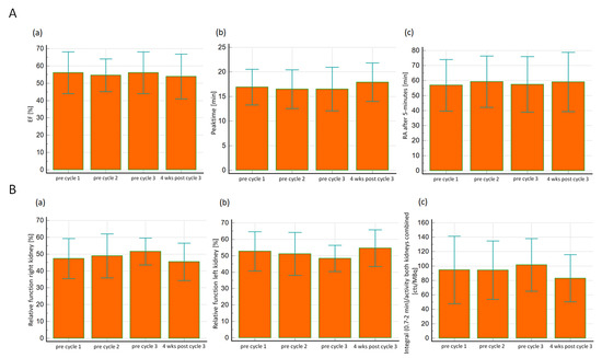 In total, 98 salivary scintigraphy were performed. In all patients (n: 27), and as demonstrated in Table 2, there was no significant difference for the EF prior to as well as between each therapy cycle and four weeks after the 3rd PSMA-RLT cycle for the right and left parotid gland as well as for the right and left submandibular gland and for all glands together. Concerning the peak time in salivary scintigraphy prior to as well as between the three therapy cycles and one month after the last therapy cycle, there was no significant difference for the right and left parotid gland, or for the right and left submandibular gland. However, for all salivary glands combined, an ANOVA test yielded significant differences in the values of peak time before the start of therapy compared to the values four weeks after the last third treatment (p = 0.03), with the Scheffé test as a post-hoc test then revealing no significant differences in mean values between cycles, as shown in Table 2. In addition, there was no significant difference between the values of RA after 5 min for the left and right parotid glands as well as for the left and right submandibular glands, and for all glands together prior to the initiation of PSMA-RLT and four weeks after the last third cycle, all depicted in Table 2 and Figure 2a.